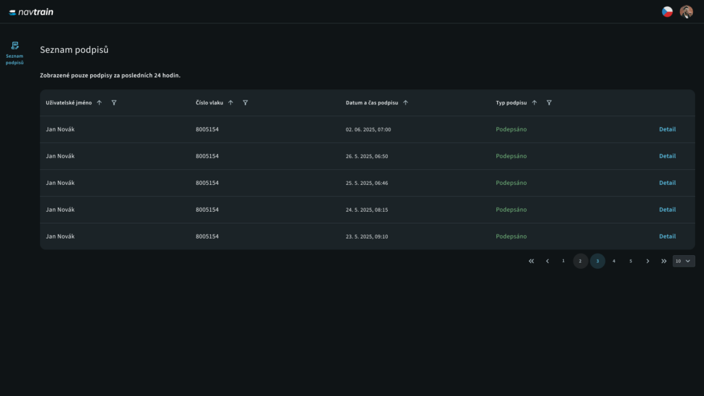Zároveň jsme připravili i související aplikaci pro dispečery, kde si mohou prohlédnout aktuální stav seznámení s SPO. Přehledně uvidí všechna podepsaná seznámení za posledních 24 hodin a základní údaje jako číslo vlaku nebo kdo a kdy dokument podepsal.